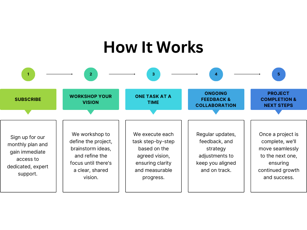 Our subscription model is designed for maximum impact without the overwhelm. By focusing on one project at a time, I’m able to give your goals my full attention, ensuring that each task is executed with precision and excellence. This approach guarantees high-quality results, clear communication, and a consistent rhythm of progress. You’re not just hiring a consultant — you’re gaining a partner committed to your success, every step of the way.